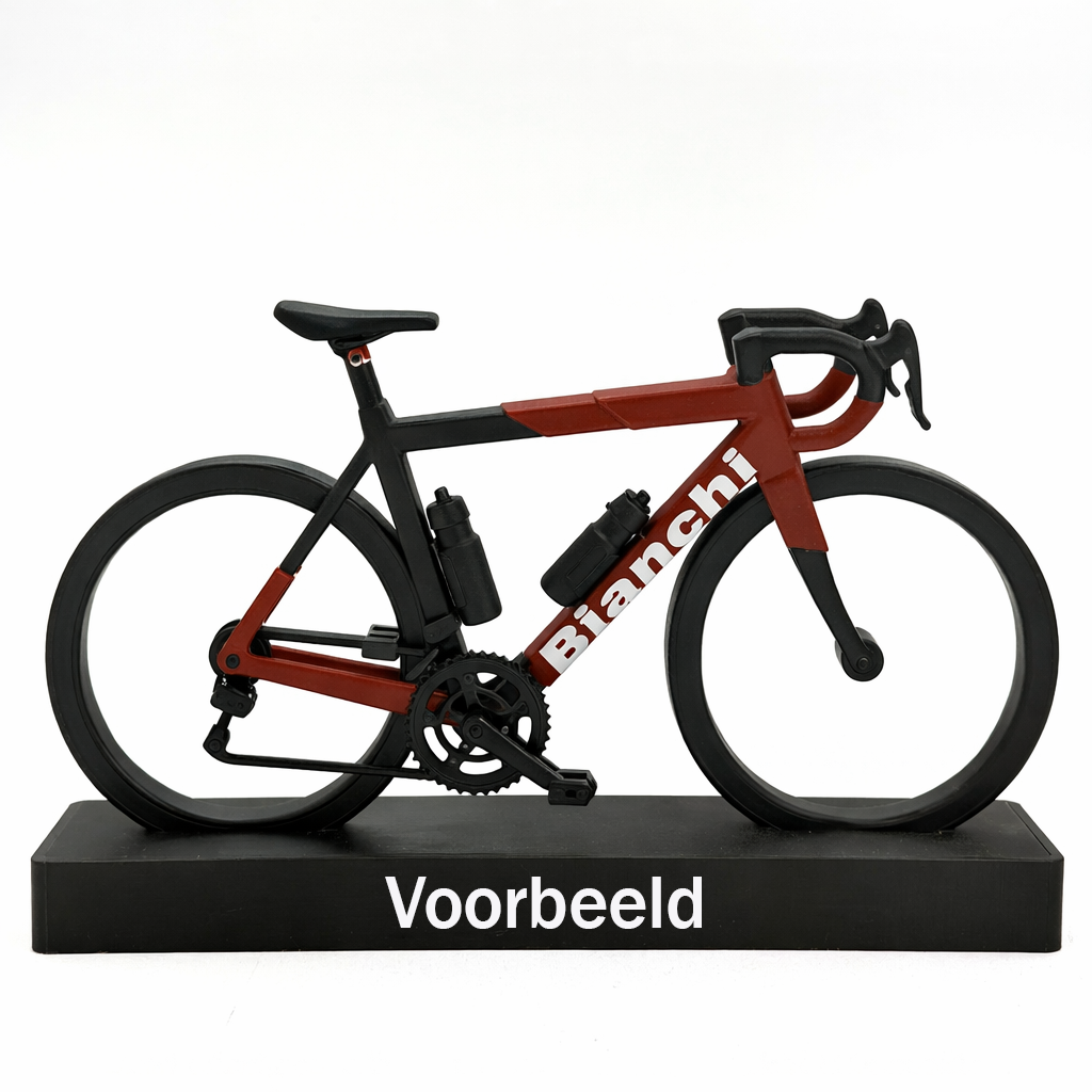 Van het aerodynamische frame tot de bidons en crankset: elk element is zorgvuldig ontworpen om de kracht en elegantie van een high-performance racefiets vast te leggen. Een echte blikvanger voor op bureau, kast, sportkamer of in de mancave van een fanatieke wielrenner.